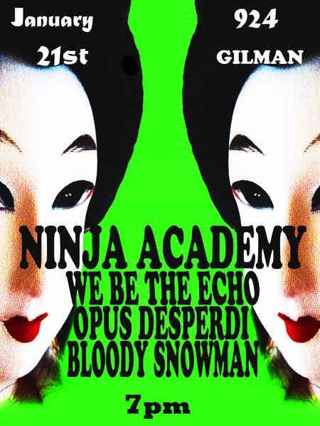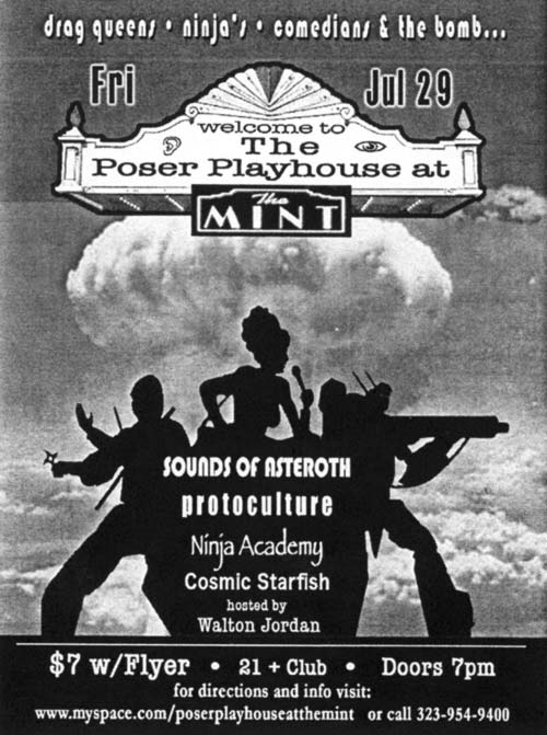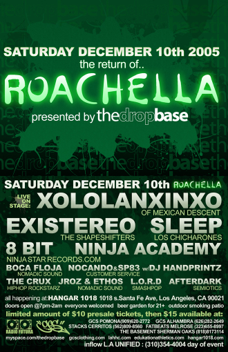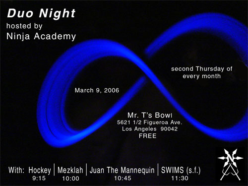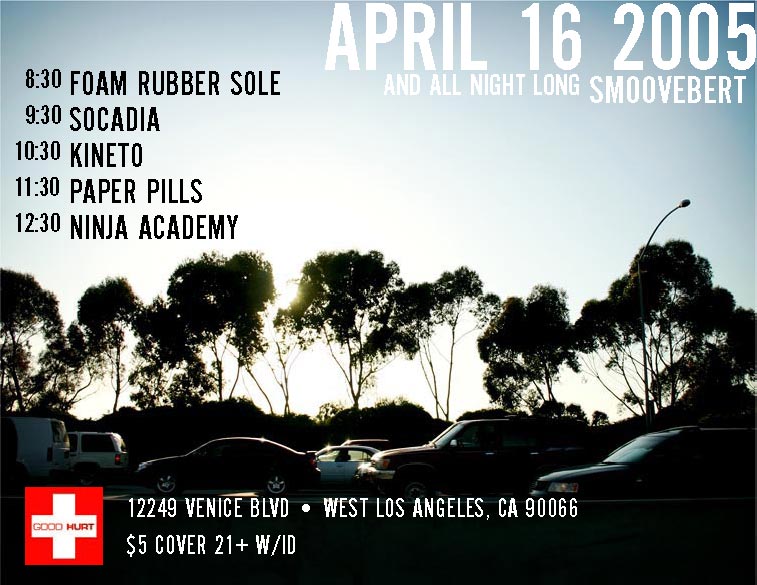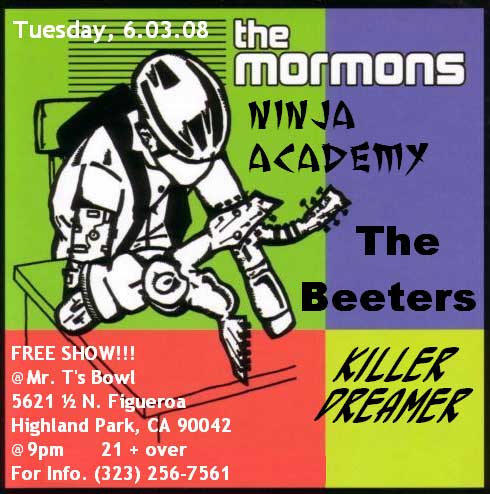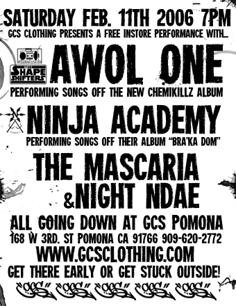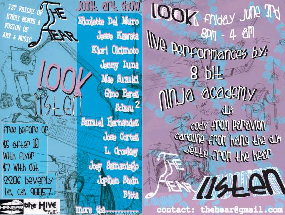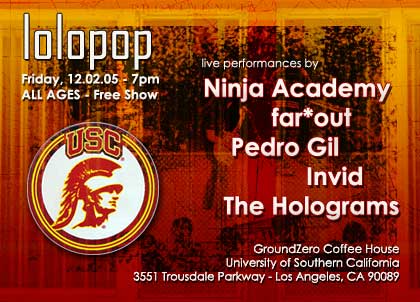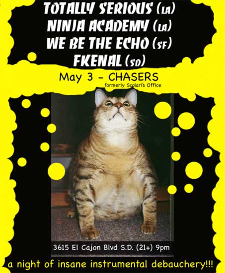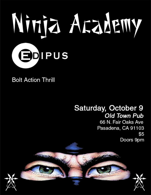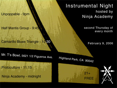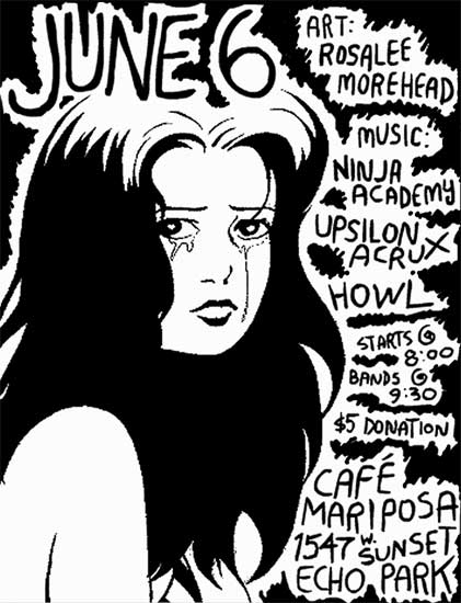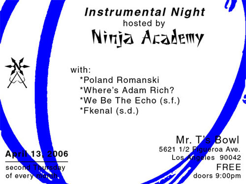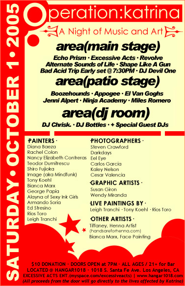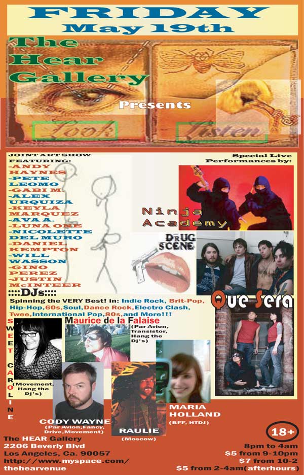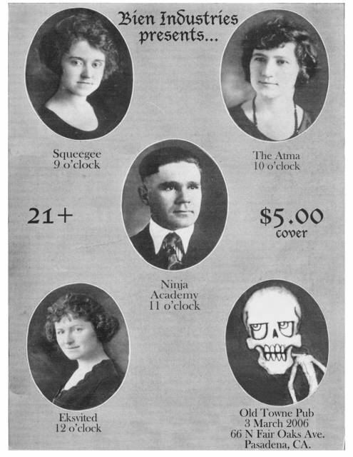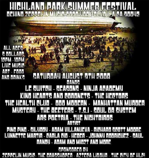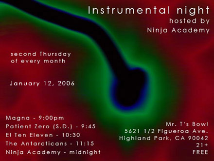 Oedipus, Bolt Thrill Action (flyer) Amor Fati "Communist" party (flyer) Wayne Healy Art Opening Adam Shenkman Comedy Show An Orchestra Cinematic, Six & Julian, Apollo Sol Freddy Diablo & His Victims, The Working Business, Alimah (flyer) We Be The Echo, La Fin Du Monde We Be The Echo, Say Bok Gwai We Be The Echo, Opus Despirdi, Bloody Snowman (flyer) Totally Serious, Witt, Solar Wimp (video) Broken Numbers Band, True Press The Mormons, The Dharma Bums, Kick Rawks We Be The Echo We Be The Echo, Totally Serious, Clevis (flyer) Church of Sexy Jesus, Baby Got Bacteria Shaolin Death Squad, The Better Death Liberate Te Ex Jesse Smith, Panta Rhei Red Team Blue Team, Smooth Tutors Zinc Pony, Skylar King Too Many Zebras, Wyldlife (flyer) The Church of The Snake, Denim Venom (flyer) Goddess is my religion Thief Thief, IttheVerb Mt. St. Helen's Vietman Band co-conspirator, Juanita and the Rabbit Charles the Osprey, Night Toucher Imaginary Friends, Caleb McCouch Bury My Teeth, Yeti vs. Yeti, Meah! (flyer) on-air performance in Spazztick Nature Walk Medicine Theory, Hip Shot Killers (flyer) Antique Scream Revolt Revolt, Mere Cat (flyer) Treetarantula, Austenitic Cull Gardening Not Architecture, Gavin Castleton, Ben Henderson 7" vinyl release w/Totally Serious, Golden Buddha, That Noise Judgement Day, Armed for Apocalypse (flyer) Judgement Day, Prids, Anon Remora, Cleveland Browns A Louder Disaster!, Junkface, We Should Be Dead Intransit Audio (flyer) Mormons, Dharma Bums, Stab City (flyer) Golden Buddha, Sugarbitch, String Theory, Splotch (flyer) Golden Buddha, Michael Jost's guitar (flyer) Judgement Day (flyer) Judgement Day Random Ninjas, Oh No Ninjas, Nam Ninja (flyer) Megalosaurus, The Gimps, Bastidas (flyer) Skateshop Showcase w/Brevi, Vesuvia Sonic Blastoids, David Liebe Hart and Adam Papagan Unpopable, Henry Burmudez Trio, The Drum Men Totally Serious, Clevis, Cinderella Motel mirrikkah, As Am I, Re-Write Dept., Mob Zombie Fourfivesix The Shifts, Broken Bottle Blues Band, Live Sound Fourfivesix, Fireworks The Triggermen Bastardos de Sancho, Street Hassle The Unreal DJs: Dorian, Fingerprince, Local Motion Satin Gum, Casino Bulldogs Zinc Pony, The March Hare, Spectral Empire, The G Ribbons The Dossier It the Verb, 14 foot 1, Hangman's Alphabet (flyer) The Mission Impossible of... Crush The Junta, Stone Baby Beardo Bandini (flyer) Cowboy Messiah, Superdot (flyer) El Ten Eleven, Metavari The Phoenix Lights Peace by Punching, Boreal Hills many bands MC Untytled RevoltRevolt Junkface, Dudes of Chaos Treetarantula, I'm a Gun (flyer) Black Delany, Tullis Mute Socialite, Say Bok Gwai Godstomper, others Memory Engine Junius, Beware of Safety performance and interview Technology, Copperthief (flyer) 4-year anniversary show Weatherground, Swamphouse ArtNight 2009 Hip Hop Benefit for Darfur (flyer) Restavrant, Glock Und Spiel Mo Bigsley Mostly Bears Mostly Bears, Colorstore Mostly Bears, Colorstore (flyer) (flyer) Totally Serious, We Be The Echo, Clevis, Good For Cows (flyer) Holding on to Sound, Mob Zombie & more (flyer) Mike Watt & the Secondmen, Marshweed, Death Punch (video) The Evangenitals, Beeters, Hello from Reno, Boxviolet (flyer) The Great Deceivers, Polar Goldie Cats, (flyer) Woven (CD release), That Noise (flyer) Asian Heritage Festival, hosted by KTLA killradio.org The Mormons, 8-bit, The Bolides, Midway (flyer) check flyer for list of bands (flyer) check flyer for list of bands (flyer) Fashzaji and others Mode Unpopable, Henry Bermudez Trio (flyer) That Noise, Beatnik Jr., The Booty Party Dysrhythmia, Upsilon Acrux, We Be The Echo, Hurt Model (flyer) Upsilon Acrux, Howl (flyer) The Mormons, The Beeters, Killer Dreamer (flyer) El Ten Eleven, Miss Massive Snowflake (flyer) Woven Surrender The Pink, Mahi Gato, Venona (flyer) Center Cannot Hold, The War On Music (flyer) Aztlan Underground, The Mystery Hangup, Geronimo (flyer) We Be The Echo, Hey Three Eyes (flyer) In-store performance Judgement Day, Desa, Build Us Airplanes, Oh No Joe (flyer) We Be The Echo, Totally Serious, Fkenal (flyer) We Be The Echo, Totally Serious, Lifeless Animation (flyer) KROQ night w/The Eye Podz Clevis, Howl (flyer) Lonely Joe Gets Shotgun, TMTMP, Souls A Fuse, The Rising Vibes Michael Cho Benefit w/Tremellow & many others (flyer) The Aliens, Michael Jost, Soul Or System (flyer) Tera Melos, El Ten Eleven, Big Moves Piel, Buddy Akai Piel, Buddy Akai Piel, Buddy Akai 400 Blows, Die Princess Die, Chinese Stars (flyer) Donita Sparks (CD release), 400 Blows (flyer) The Gears, Disguster & many more (flyer) Mahi Gato Apex Theory, Arto Tuncboyaciyan, Chameleon Conductor (flyer) Nels Cline Singers, Eugene Chadbourne, The Mentones Masterslave, Lady Sinatra (flyer) Piel Nimbus, Woven, Vokee (flyer) Free Moral Agents, Tremellow, The Action Design (flyer) AIDS Benefit show (Artist appreciation night) (flyer) That Noise, Paper Pills, We Be The Echo We Be The Echo, The Deluge, Lifeless Animation El Ten Eleven, Parsley Flakes Shrimp Foxy Autopsy, The Trixies The Janitor, The Sirens, The Mormons The Deluge Center Cannot Hold, Anthony Shadduck, The Deluge, The Vageniuses Die Die Die, HEALTH, The Valley Arena Henry Bermudez, The Invisible Plan, Batman vs. Predator Batman vs. Predator, Masterslave, Lamexcuse Mongoloid, Bike Fight, Helper Monkey & more East/West Quintet, pb&j...and g, Roboto Love Haru Kuroi (record release) Balloon Bass, Imagine"the"Band, these orphaned eyes Dave Culwell Trio, Trio Formaggio, Nick Rosen Trio Polygraph, Michael Jost, Iron Mtn. Monster Truck Station Wagon, The Aliens, Echoes of a Boundless Life 400 Blows, Horace Weintraub (flyer) Gravy Train, Groovy Ghoulies, Floating Corpses & others (flyer) We Be The Echo, Featherweight Champion of the World D.P.'s last show w/ 8-bit, The Mormons, We Be The Echo (flyer 1,2) 1-year Instrumental Night anniversary w/ Clevis, Sybil 8-bit (CD release), The Mormons, Bodies of Water, Seasons Dream Sequence, Solace (flyer) Please Don't Throw Rocks At Us Juan The Mannequin, Alsoran